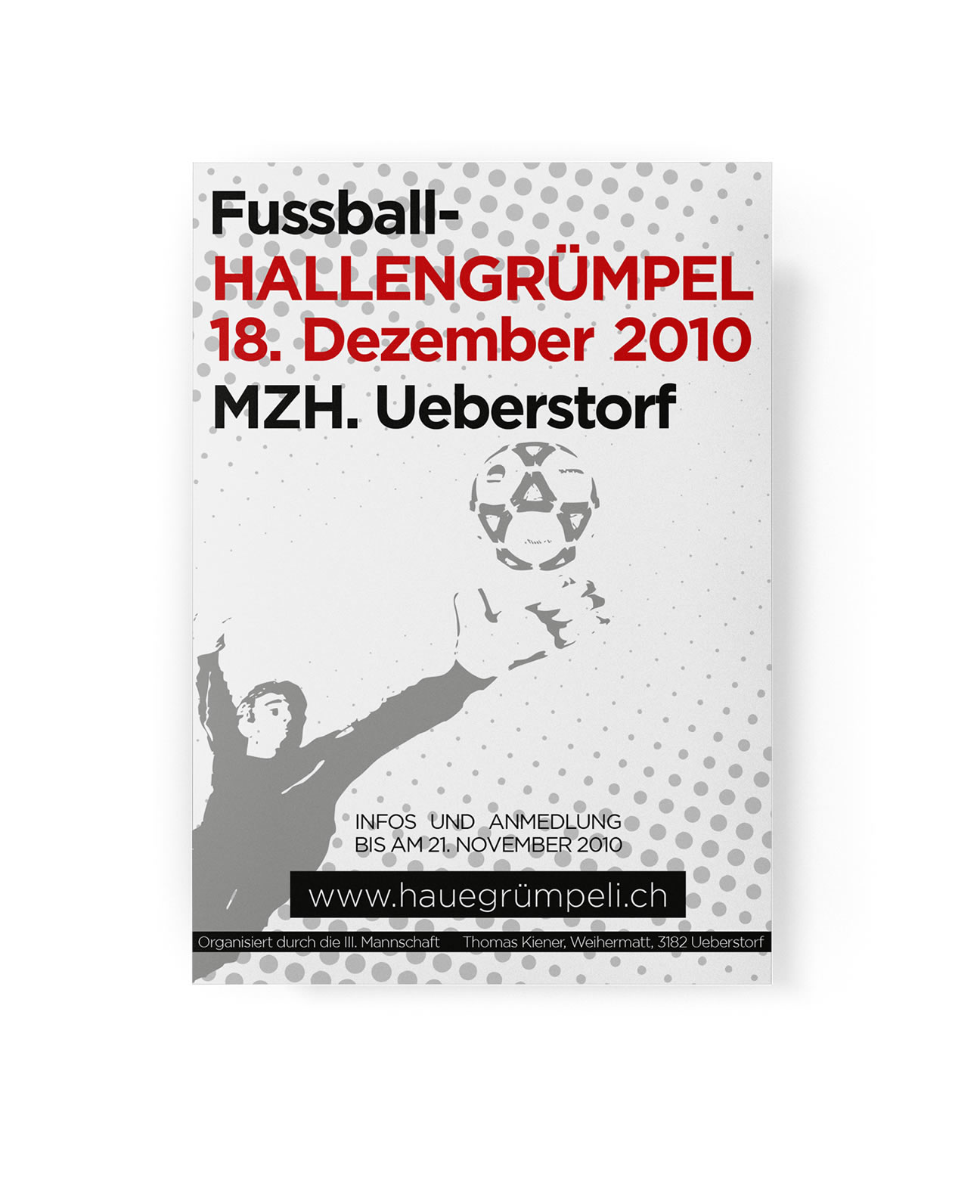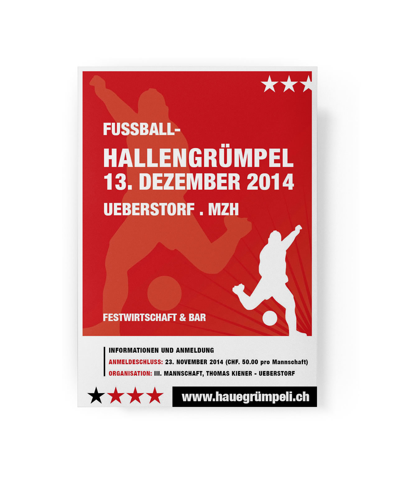 Entstanden sind drei verschiedene Designs. Die Farben Rot und Blau welche auch im FC Logo und im Gemeindewappen von Ueberstorf anzutreffen sind habe ich in die Plakate einfliessen lasssen. Der Fussballspieler, dazu ein Torhüter und einen Ball sowie trendige Schriftarten zieren das Plakat und machen es zu einem echten Hingucker.