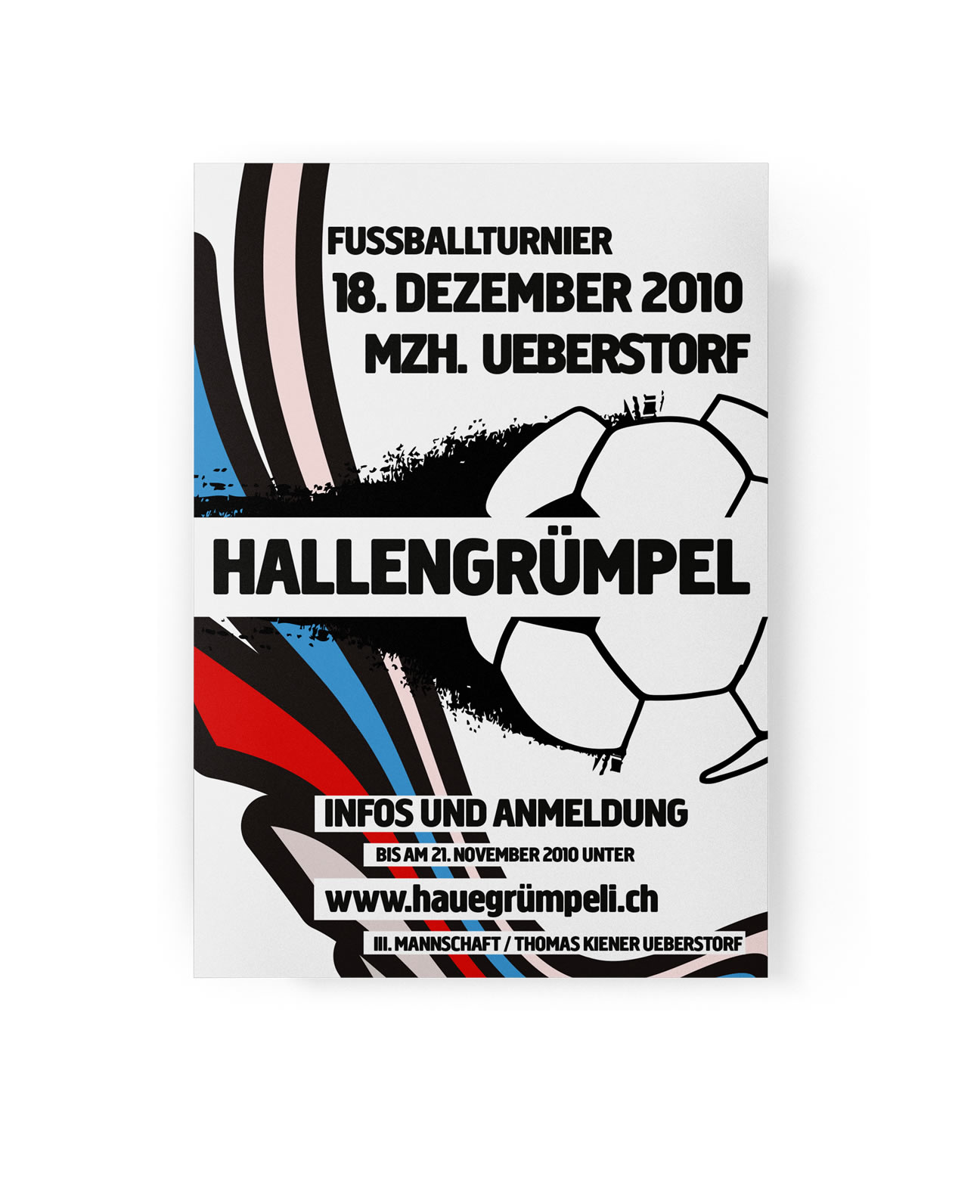 Entstanden sind drei verschiedene Designs. Die Farben Rot und Blau welche auch im FC Logo und im Gemeindewappen von Ueberstorf anzutreffen sind habe ich in die Plakate einfliessen lasssen. Der Fussballspieler, dazu ein Torhüter und einen Ball sowie trendige Schriftarten zieren das Plakat und machen es zu einem echten Hingucker.