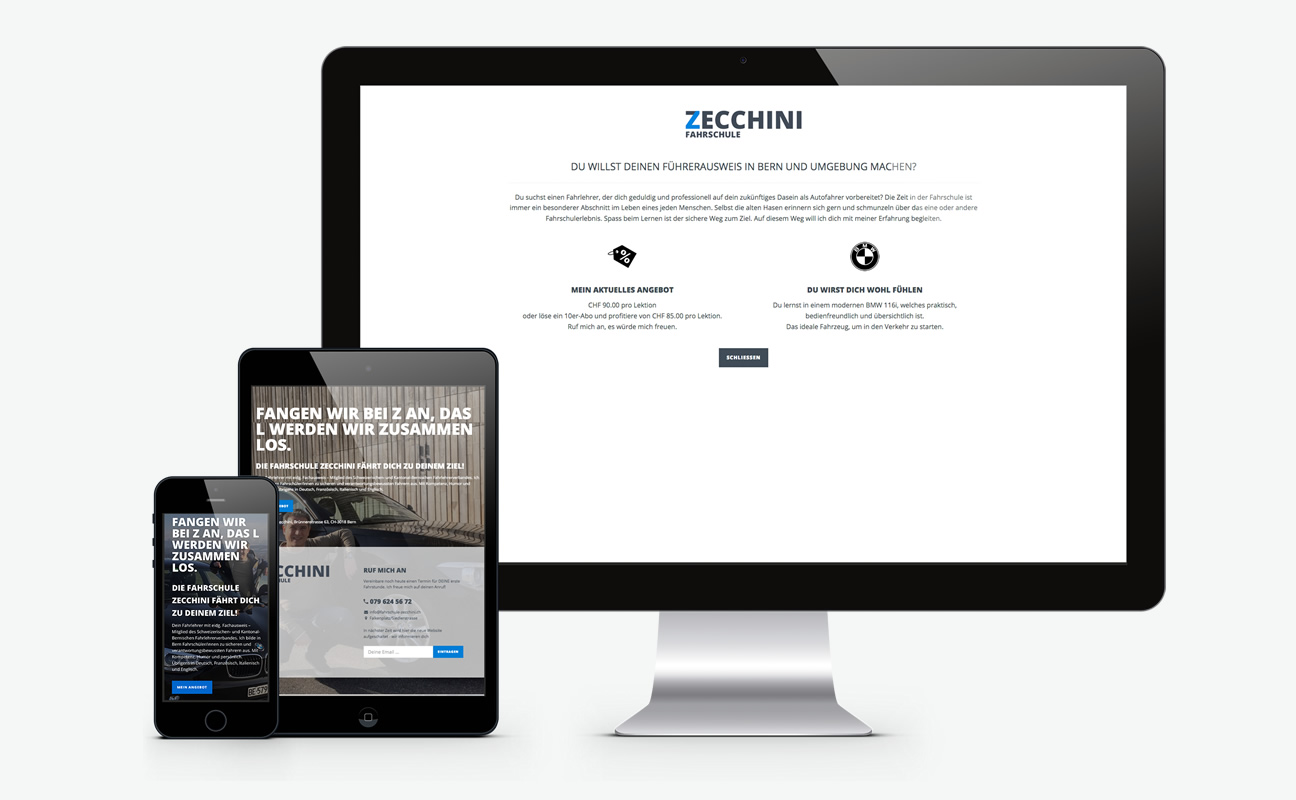 Die Fahrschule Zechini ist in den Regionen Bern, Köniz, Schliern, Wabern, Belp, Ostermundigen und Bümpliz, Niederwangen, Flamatt unterwegs. Inhaber Thomas Zecchini hat mich gebeten, die Webseite zu erstellen, damit aktuelle Daten und Angebote, sowie allgemeine Informationen schnell und einfach zugänglich sind. Ausserdem wünschte er, die Trefferquote bei Google durch eine Suchmaschinen Optimierung zu verbessern. Die übersichtliche Webseite haben ich vorerst als einfache Onepage aufgebaut und wird später zu einer Multipage umstrukturiert.
